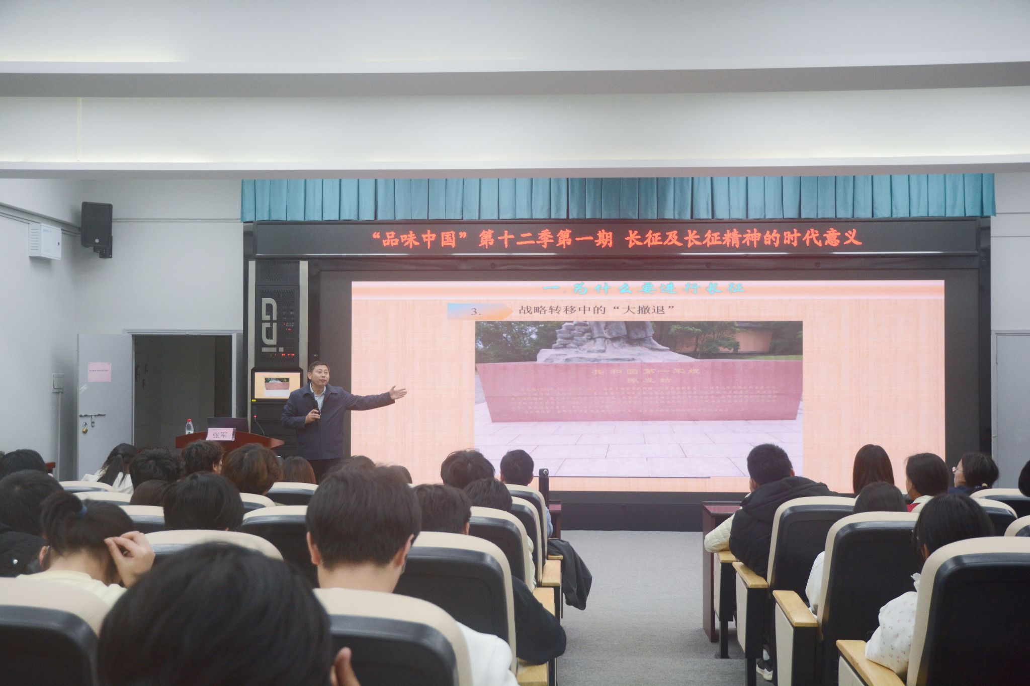 张军以中外各界对长征的评价为引,鲜明指出长征重要的历史地位,进而围绕“为什么要进行长征”“中央红军长征的行程与主要事件节点”“长征的时代意义”三大板块进行系统讲解。他深入剖析了第五次反“围剿”失败的原由,清晰梳理了事件相关的历史背景与人物关系,并结合四渡赤水、强渡大渡河、飞夺泸定桥等经典战役,以及陈发姑事迹、“半条棉被”、彝海结盟等动人史实,生动展现了工农红军的坚定理想信念与军民鱼水情深。谈及长征的时代意义,张军重点讲述了徐海东为中央红军雪中送炭5000银圆和李先念率西路军余部归队的典型事迹,向在场学子强调顾全大局、团结一心是成事立业的关键因素。讲座最后,他援引习近平总书记对长征精神的高度评价,号召同学们传承红色基因,以青春热血投身民族复兴伟业。