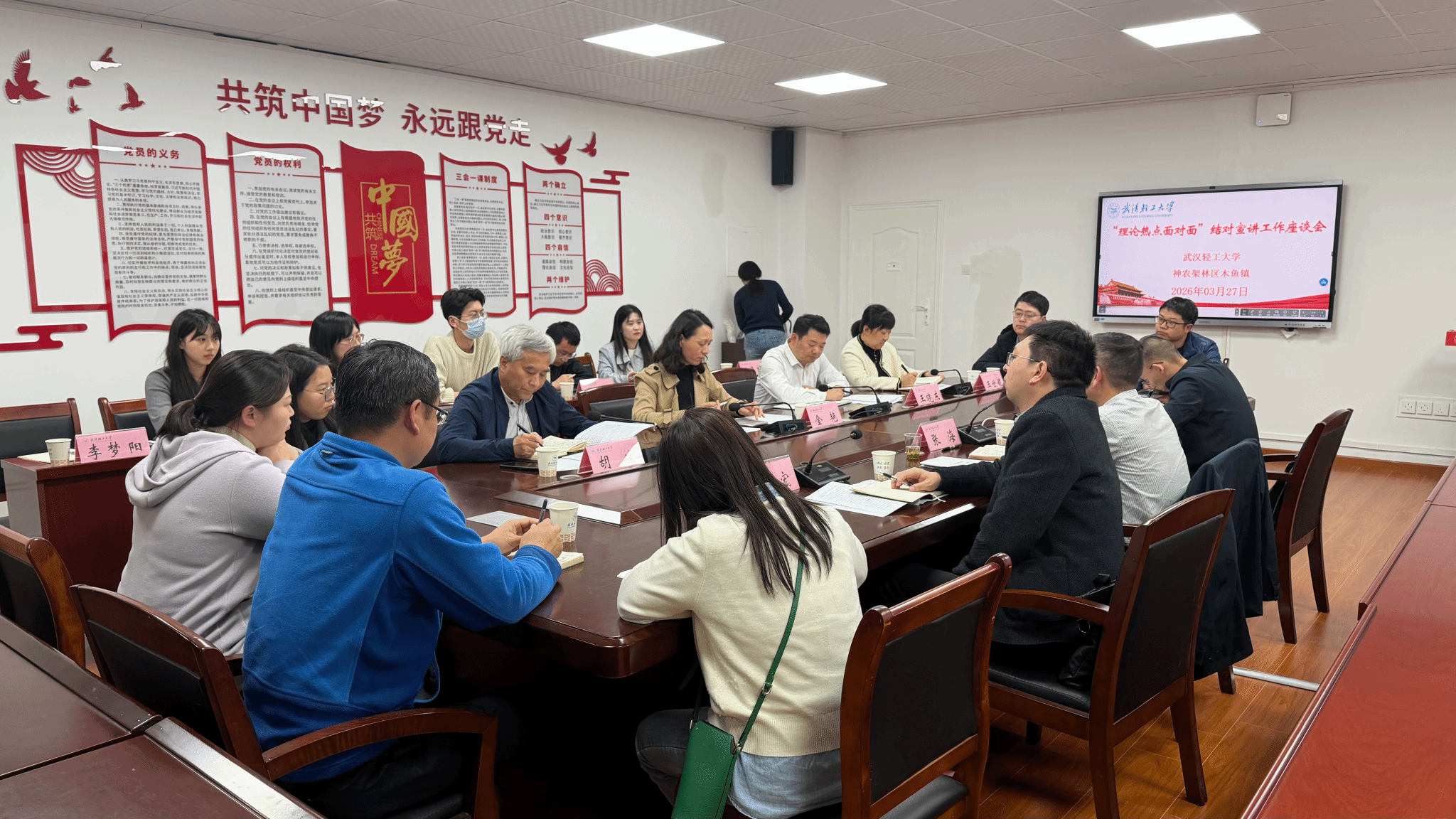3月27日,武汉轻工大学在马克思主义学院召开“理论热点面对面”结对宣讲工作座谈会。学校党委副书记、副校长金艳,神农架林区党委宣传部副部长张海出席会议。神农架林区党委宣传部、木鱼镇相关负责人,学校党委宣传部、马克思主义学院负责人及学校“百马行动”宣讲团成员、部分学院代表参加座谈。会议由马克思主义学院党委书记王晓东主持。