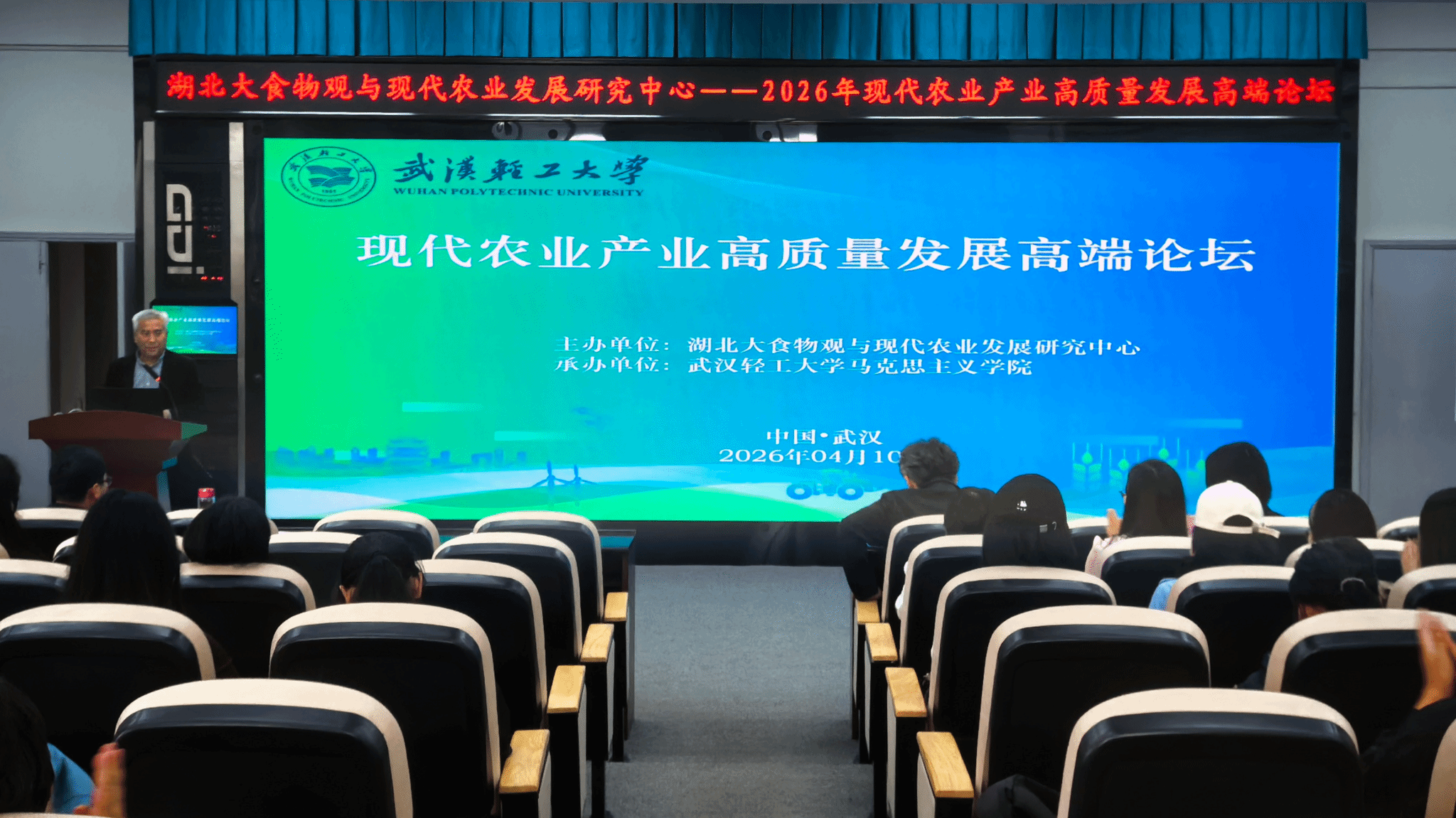 为深入推进大食物观研究、拓展农业国际化视野,助力农业强国与乡村振兴战略实施,4月10日上午,武汉轻工大学马克思主义学院联合湖北大食物观与农业发展研究中心在积学楼209会议室举办2026年现代农业产业高质量发展高端论坛。本次论坛特邀韩国东西大学朴弘植教授、马克思主义学院张健博士作专题学术报告。院长胡沫主持会议,学院全体教师及研究生参会。