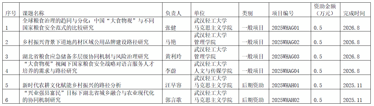 2025年湖北大食物观与现代农业发展研究中心开放课题已完成受理申报、专家评审和网上公示等各项程序,现将立项课题名单予以公布: